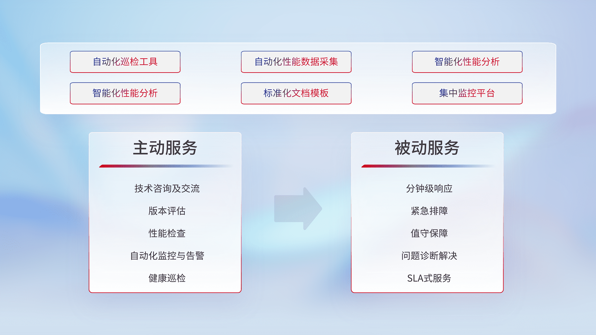智能化工具和标准化文档,,,,保障服务质量,,,提供主动服务(包含技术咨询、、、版本评估、、、、性能检查、、自动化监控与告警、、、、健康巡检)和被动服务包含(分钟级响应、、紧急排障、、值守保障、、、问题诊断解决、、、、SLA服务)。。。。