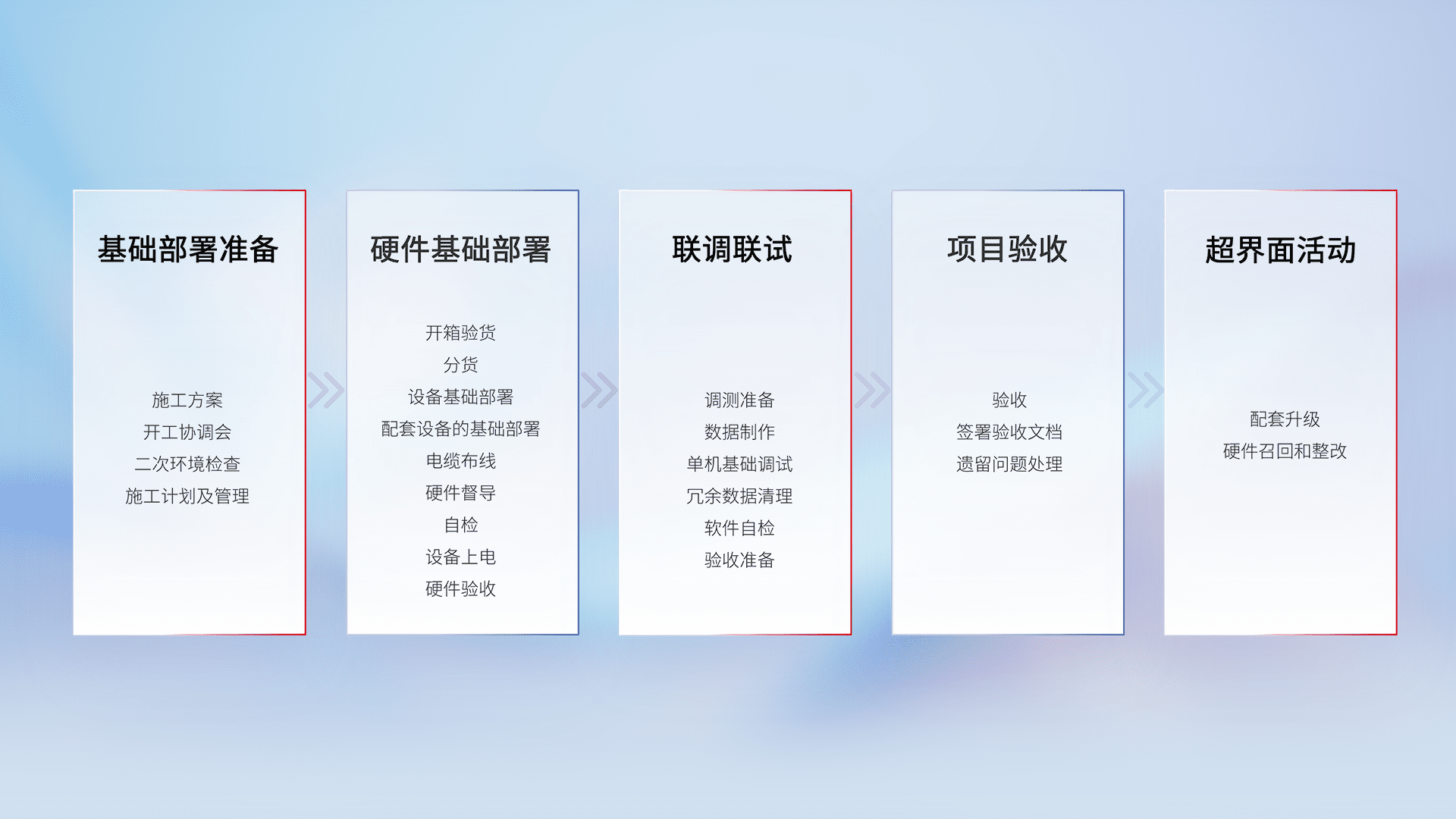 从基础部署准备、、、硬件基础部署、、联调联试、、、、项目验收、、、越界面活动的全过程可追溯,,,保证施工质量和进度。。。
